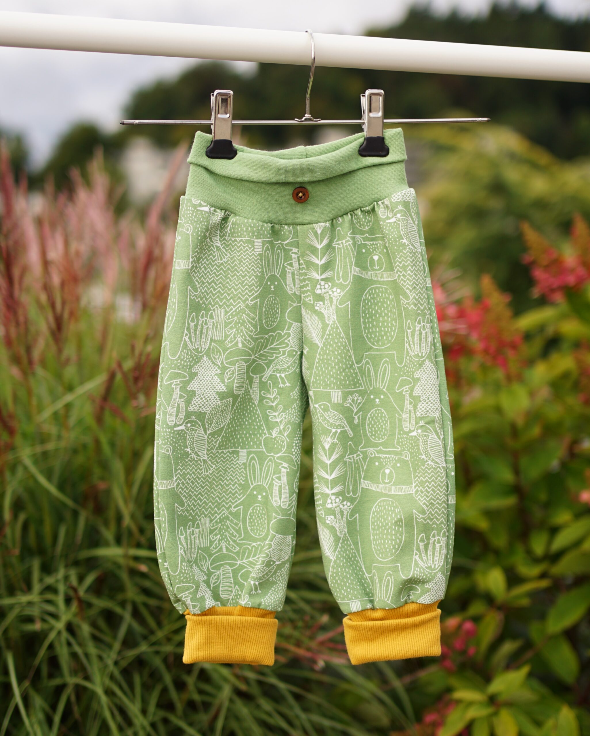 Babyhöschen Grösse 80 aus bequemem Jersey-Stoff mit elastischem Hosenbund und Beinbündchen. Dekorativer Holzknopf am Hosenbund. Die umklappbaren Bündchen sorgen dafür, dass die Hose mit deinem Baby mitwächst.