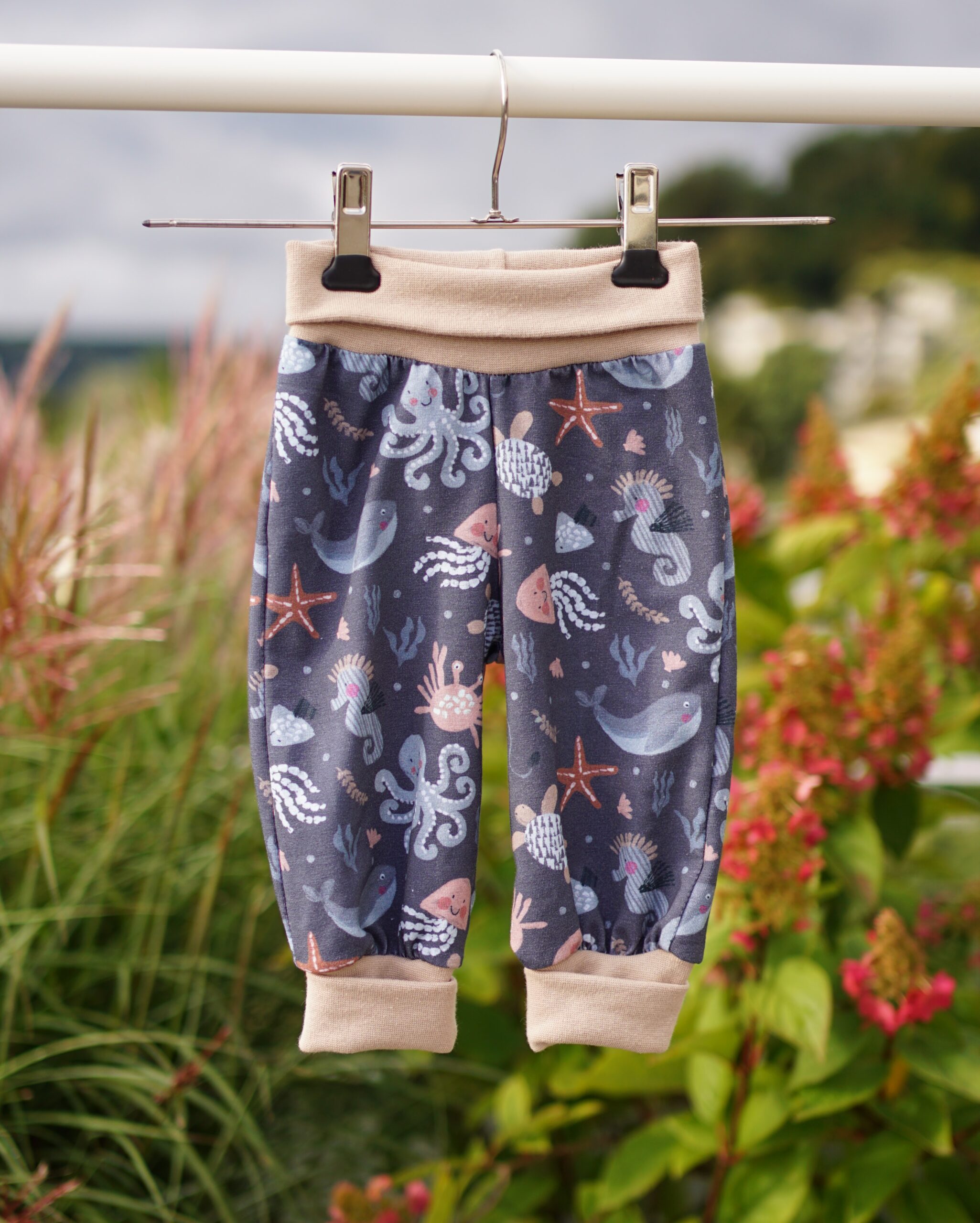Babyhöschen Grösse 68 aus bequemem Jersey-Stoff mit elastischem Hosenbund und Beinbündchen. Die umklappbaren Bündchen sorgen dafür, dass die Hose mit deinem Baby mitwächst.